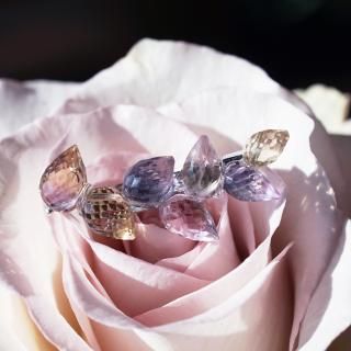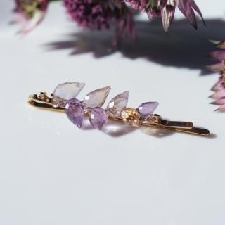 ラベンダーの妖麗な美しさをもつ花穂を、 アメジスト、シトリン、アメトリンを使ってヘアピンに仕立てました。