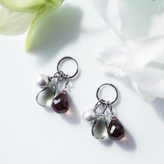 癒しのカラーをもつスモーキークォーツのラフカット、 虹色の光沢のスティック真珠をアシンメトリーに備えて、 冬の木立をジュエリーに。