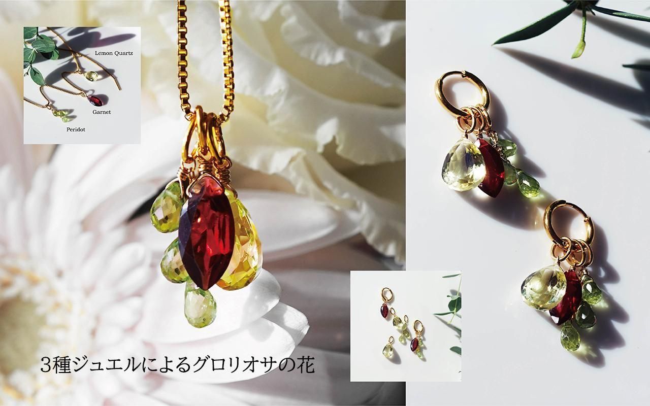 グロリオサの花のデザインに仕立てられた3種のジュエル。