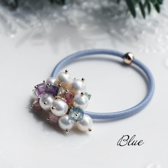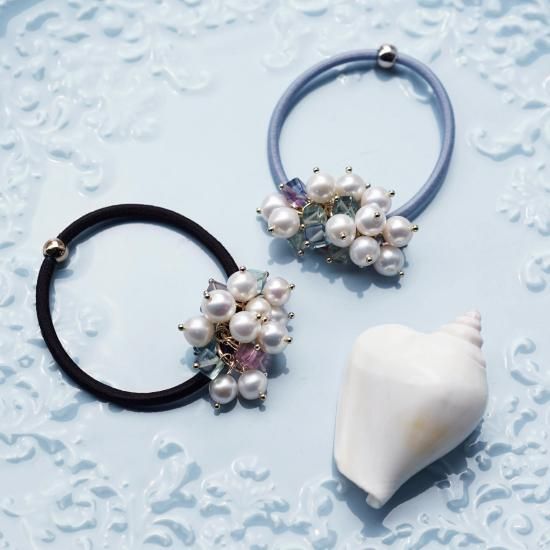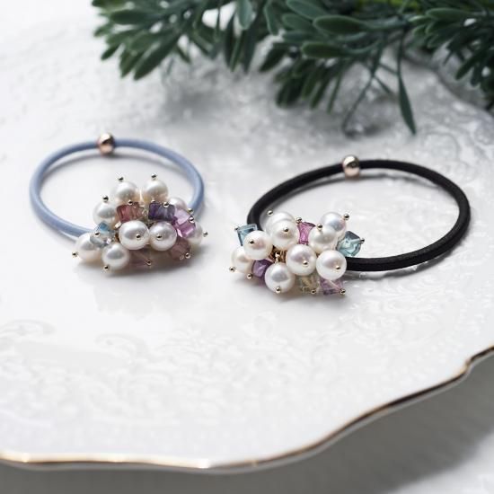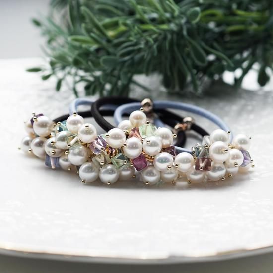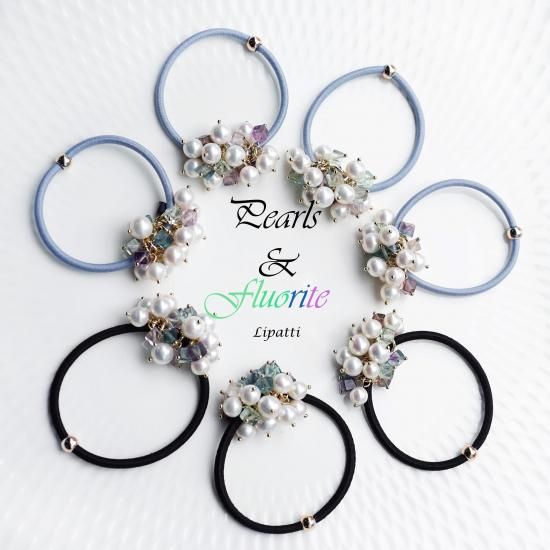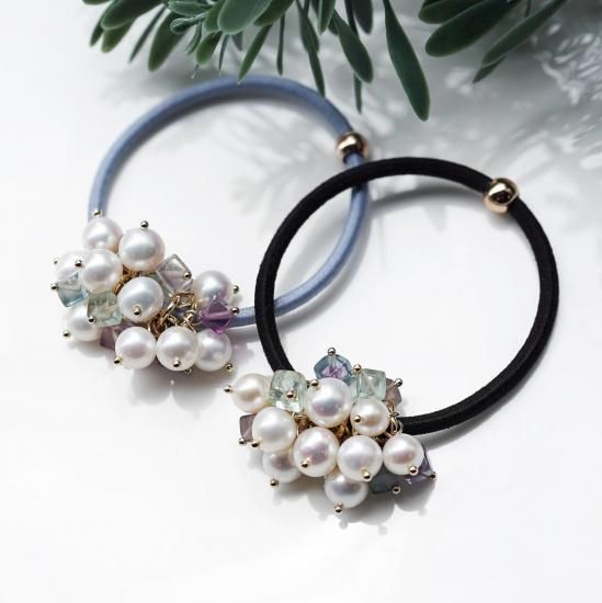 フローライトと真珠の組み合わせが、上品で柔らかな印象のヘアゴムですよね。