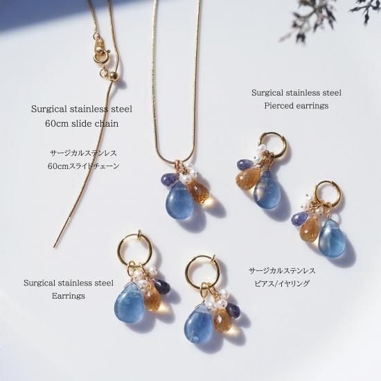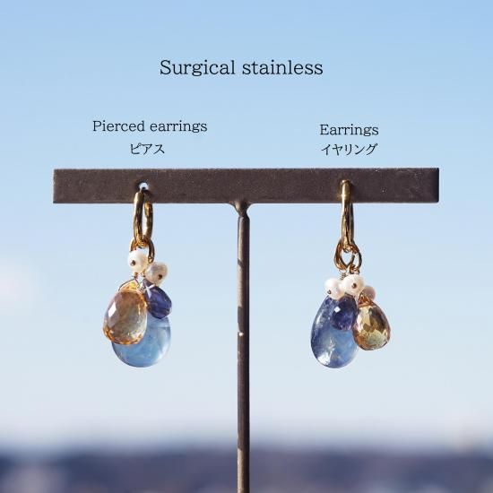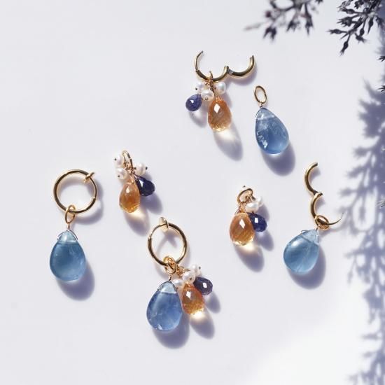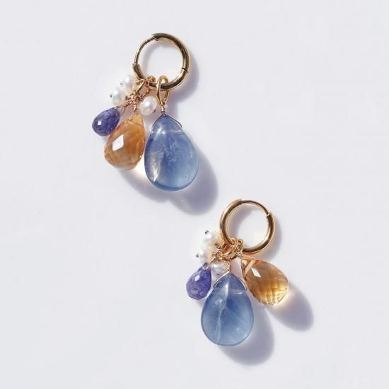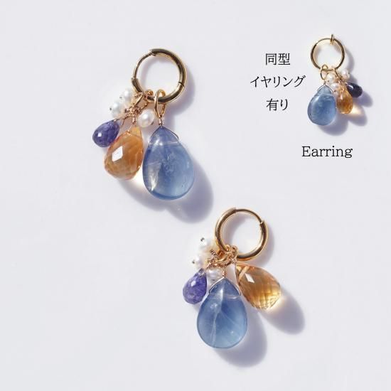 ブルーが美しいフローライト、ブリオレットドロップの煌めくシトリン、アイオライト、美しい水しぶきのように、小粒の真珠を散らしています。