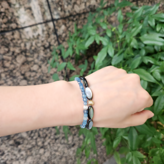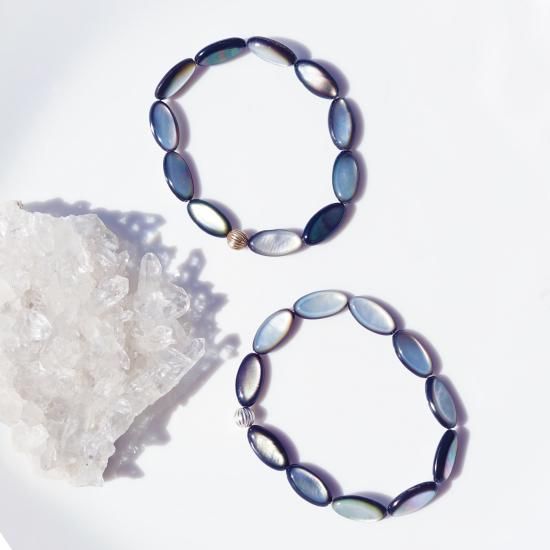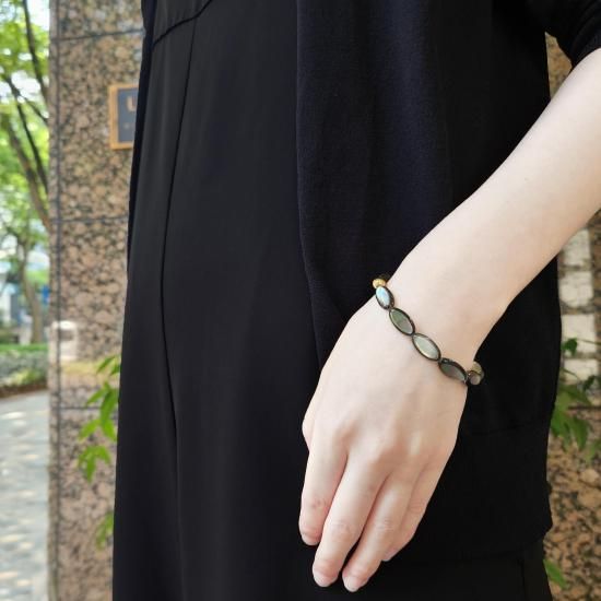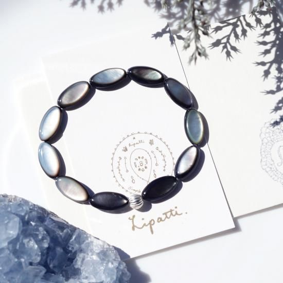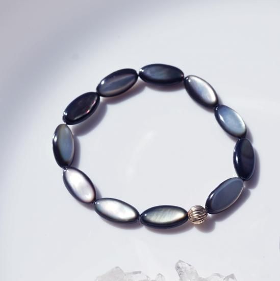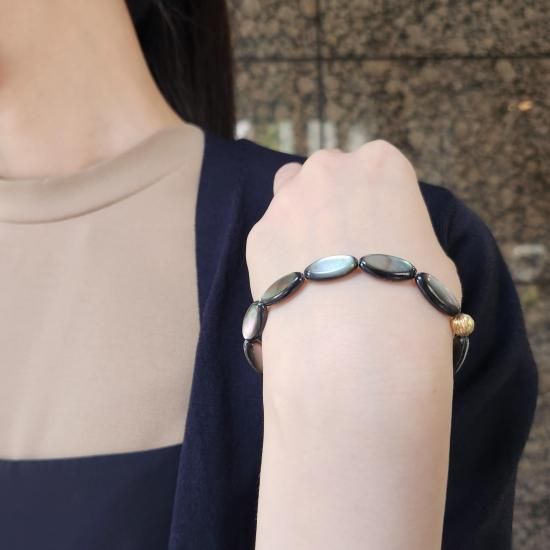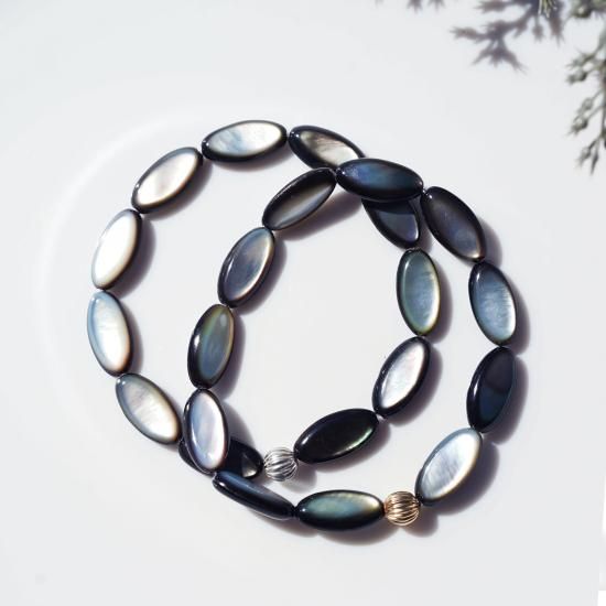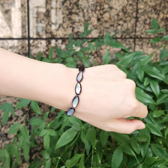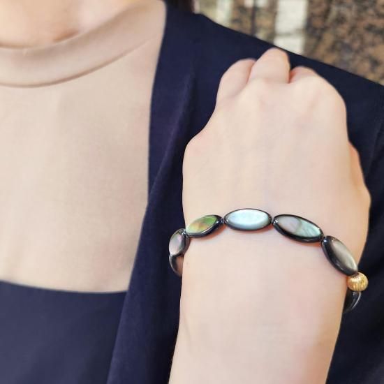漆黒の中に虹色を閃かせる黒蝶貝のブレスレット。