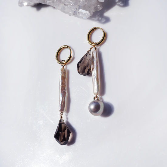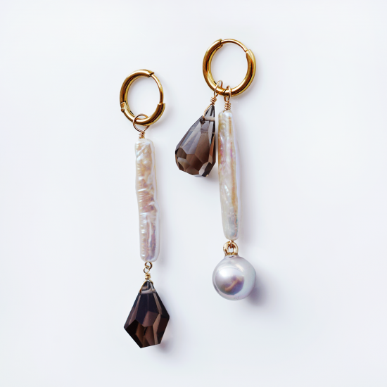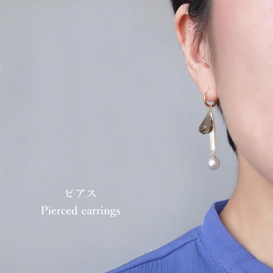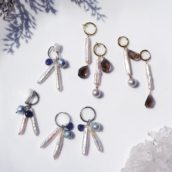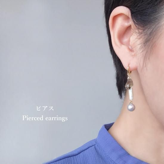 大人っぽいオーロラグレーの貝パールをあえてアシンメトリーに備えて、