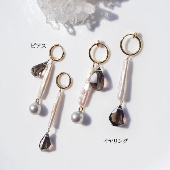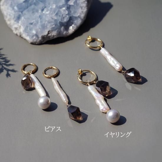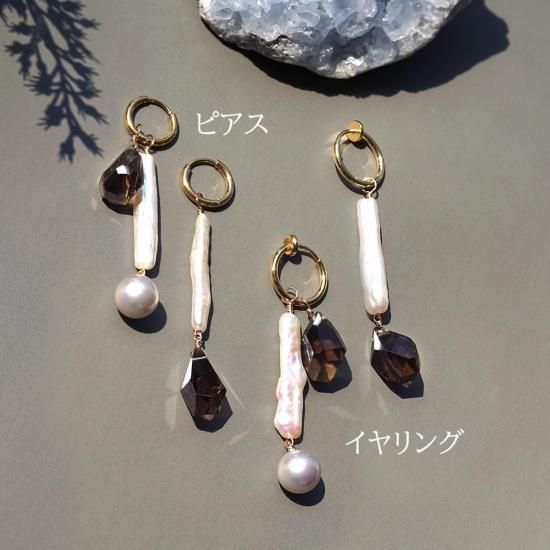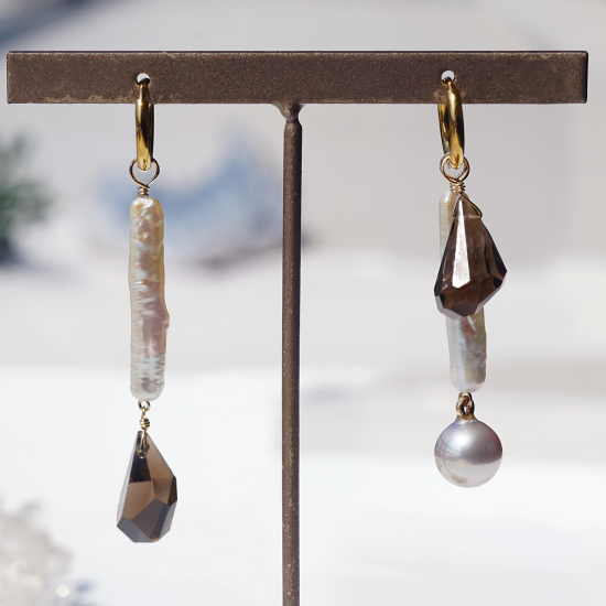 クォーツも真珠もユニークなシェイプで、優しい表情の天然石ながらエキゾティックなクールさがあります。