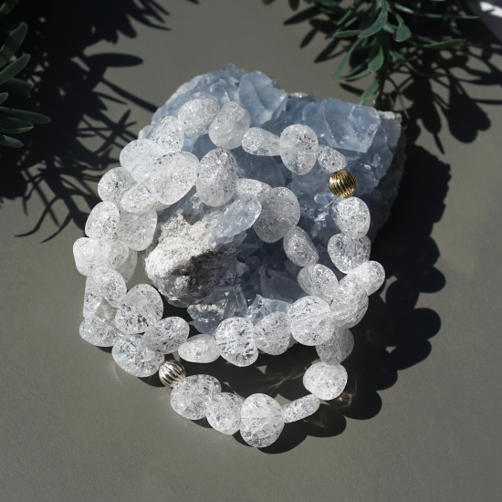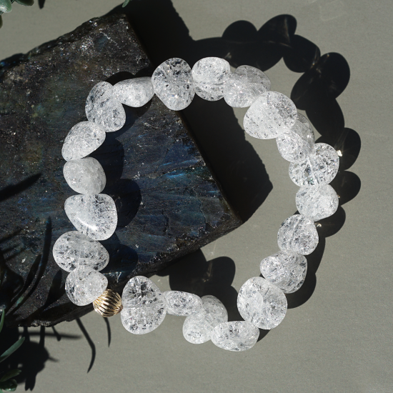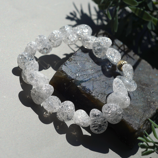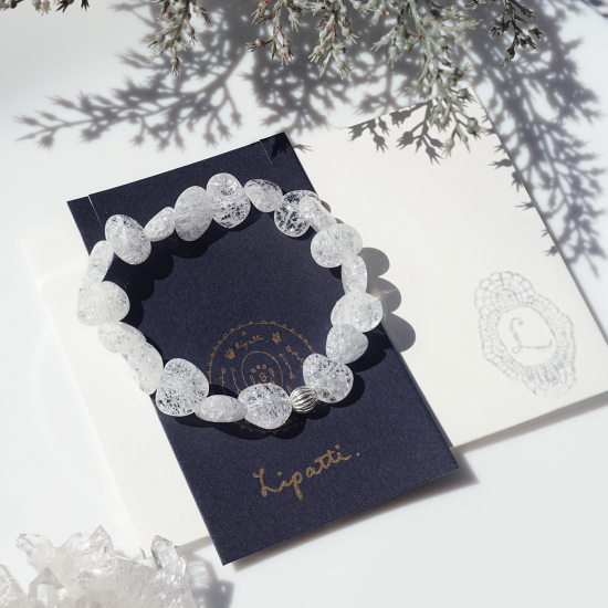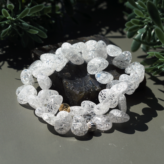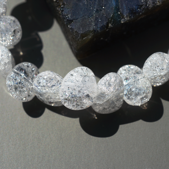 爆裂水晶は、水晶(クリスタル)の内部にできた微細なクラック(ひび)に光が反射することで、虹色の輝きが見られる天然石です。別名「レインボークォーツ」とも呼ばれ、ギリシャ神話の虹の女神「アイリス」に由来する名前が付けられています。この虹色の輝きは「イリデッセンス」と呼ばれ、見る角度や光の当たり方によって様々な表情を見せます。