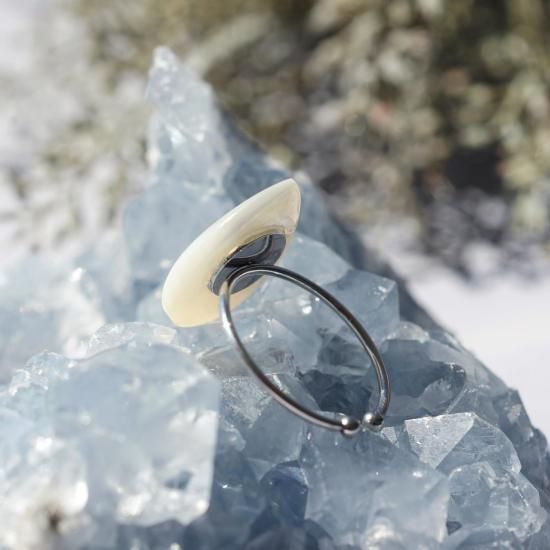 真珠母貝。今回は白蝶貝を使用しています。貝の裏側にある真珠層を用いた素材です。光が当たると虹色に輝き、贅沢な美しい光沢を放ちます。