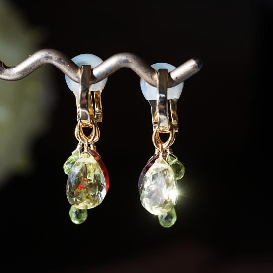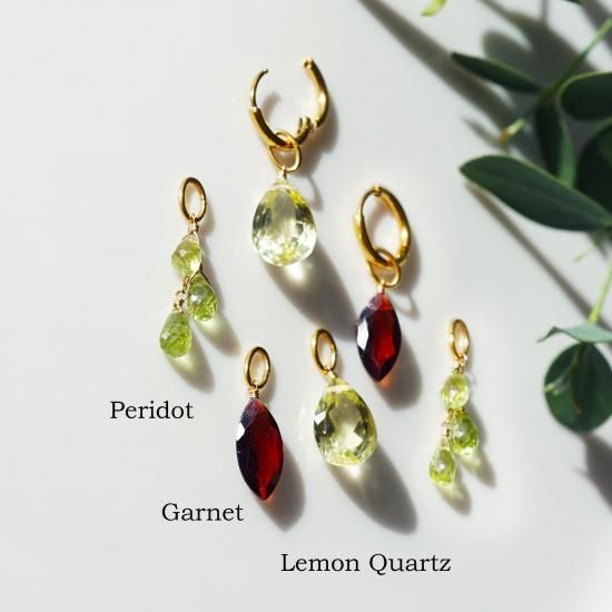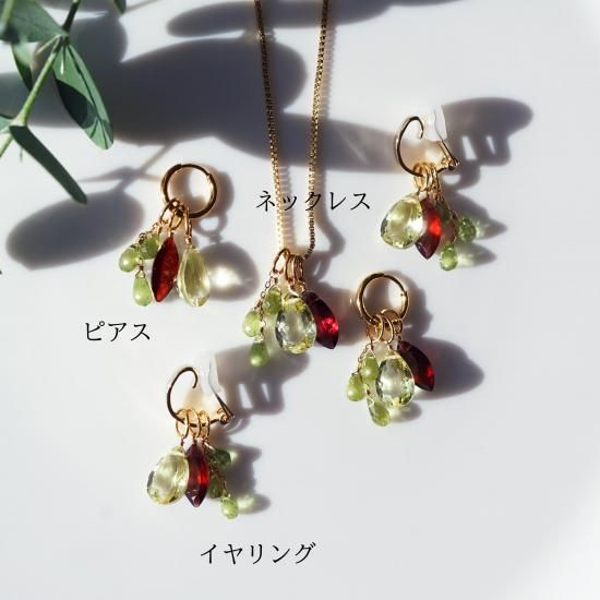 しなだれるペリドットとガーネットとともにデザインされた愛らしいピアスは季節感をぐっと引きたててくれる清涼感のある組み合わせです。