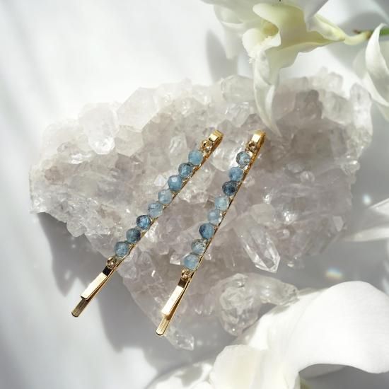 アクアマリンのヘアピンも愛用しています。この度ディープアクアマリンのヘアピンが登場とのことで早速飛びつきました!その名の通り深みのある表情豊かなアクアマリンが並ぶ素敵なヘアピンでした。
